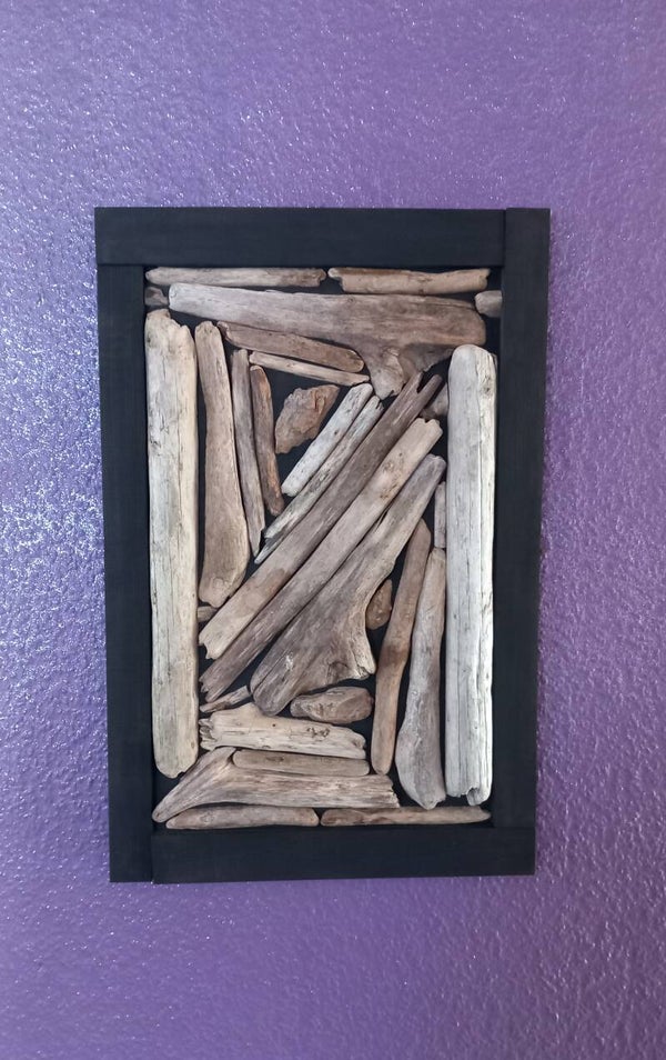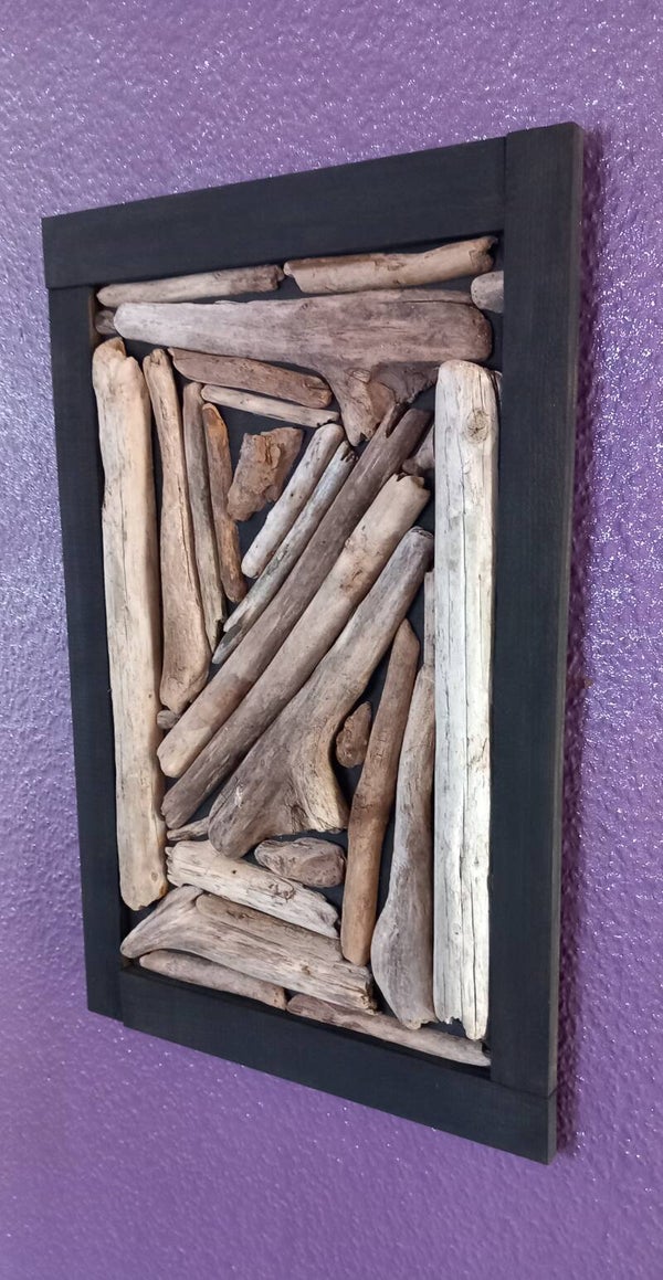 In dieser Holzwandkunst bleibt das Holz völlig natürlich. Die Einzelstücke sind mit natürlichem Holz Weissleim auf eine mattschwarz lackierte Sperrholzplatte aufgeklebt.
